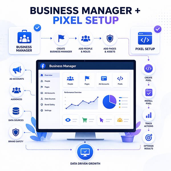 Our Business Manager + Pixel Setup service ensures accurate tracking, better ad performance, and scalable growth for your Facebook and Instagram marketing.