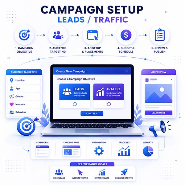 A well-structured ad campaign is key to generating leads, driving traffic, and achieving measurable business results. Our Campaign Setup service focuses on creating optimized Facebook and Instagram campaigns tailored to your business objectives, whether it’s lead generation or website traffic. We ensure proper targeting, creative placement, and tracking for maximum ROI.