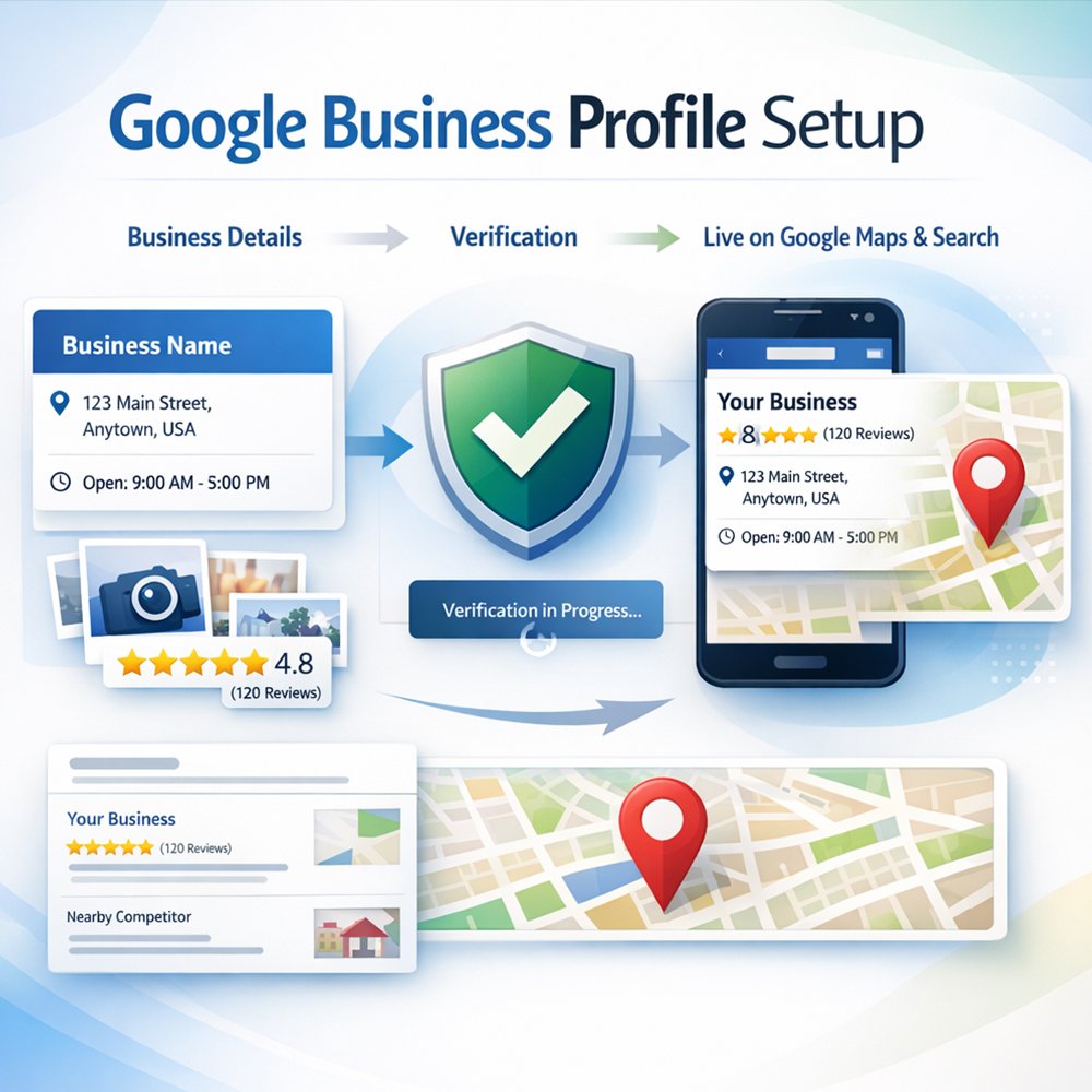 Our Google Business Profile Setup service helps your business appear in local searches, attract customers, and improve credibility online.