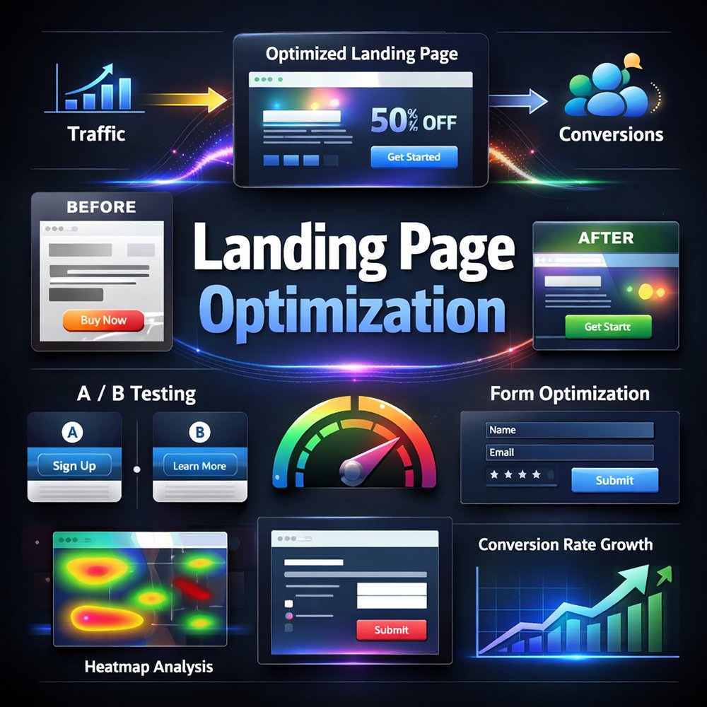 Landing Page Optimization focuses on improving the effectiveness of your landing pages to convert visitors into leads or customers. A well-optimized landing page clearly communicates value, guides users toward a single goal, and removes distractions that prevent conversions. Our optimization process combines design, content, UX, and data insights to maximize performance and ROI.