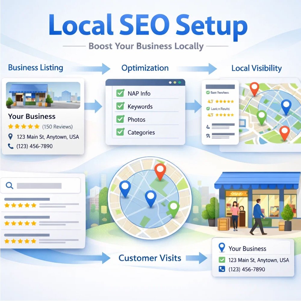 Our Local SEO Setup optimizes your Google My Business profile and local keywords to improve visibility in Google Maps and local search results. We help attract nearby customers, increase calls and inquiries, and strengthen local presence. Ideal for businesses targeting specific locations and aiming to grow through local search traffic.