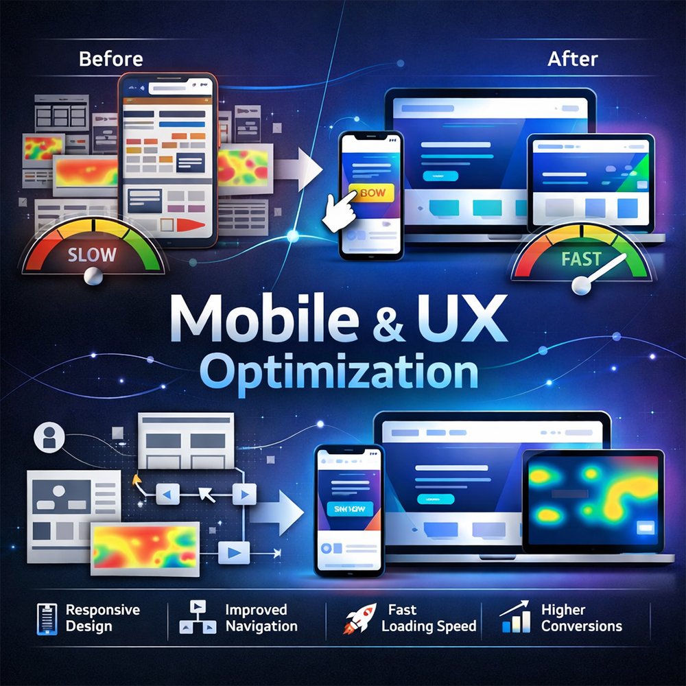 Our Mobile & UX Optimization service enhances mobile usability, speed, and user experience. We optimize responsive design, navigation, performance, and conversions to ensure seamless interactions on all devices. Ideal for businesses aiming to improve mobile engagement, reduce bounce rates, and maximize conversions through a mobile-first experience.
